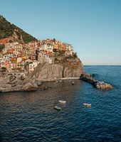 Een zonnige zomerdag in Cinque Terre in Italië. Het blauwe water tekent af tegen de pastelkleuren van de huisjes.