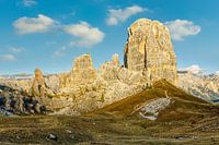 De rotsformatie Cinque Torri aan de Falzarego Pass in de Dolomieten in de provincie Belluno baadt in een warm licht door de avondzon.
