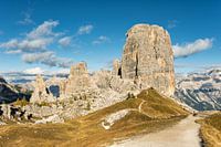 Middagzon bij de rotsformatie Cinque Torri aan de Falzarego Pass in de Dolomieten in de provincie Belluno.