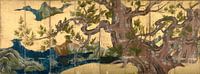 Cipressen, Kano Eitoku (16e eeuw) Tegen een achtergrond van goudkleurige grond en wolken vult de krachtige vorm van een enorme boom het scherm met zijn grote uitgespreide takken. Door de achtergrond te vereenvoudigen, het aantal kleuren te minimaliseren en de boomschors energiek af te beelden met een schijnbaar grof penseel, heeft de kunstenaar de dwingende aanwezigheid van de cipresboom benadrukt. Het donkerblauwe water van een vijver gluurt uit openingen in de gouden grond en gouden wolken. De sterke levenskracht van de machtige boom toont de eigen gepassioneerde geest van de kunstenaar en brengt tegelijkertijd de ongedwongen esthetiek van de elite-krijgers van Momoyama over.