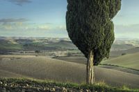 Cipressen en pijnbomen op de heuvels van de Crete Senesi. Landschap in Lucignano d'Arbia, regio Toscane. Italië