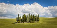 De beroemde cirkel van cipressen gelegen in Val d'Orcia in de buurt van de stad Torrenieri en Montalcino in het hart van Toscane in midden Italië.