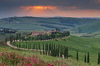 Een prachtige slingerende cipressenlaan die uitkomt op een Agriturismo een verbouwde boerderij waar je kunt slapen. De zonsondergang na een flinke onweersbui maakt het beeld geheel af.