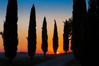 Deze cipressen geven een mooi silhouet tegen de ondergaande zon. Dit laantje ligt bij Asciano, Toscane, Italië.