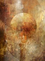 In het midden domineert een zachte, ronde vorm een cirkel die als een zon of maan oplicht tegen een gelaagde achtergrond van aardetinten.