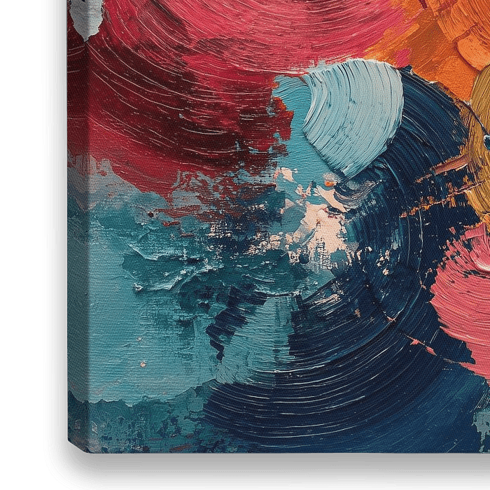 Een abstracte compositie gevuld met wervelende, gestructureerde penseelstreken. Op de voorgrond overlappen cirkelvormige figuren in warme kleuren elkaar en vloeien over in koelere tinten. Het samenspel van licht en schaduw binnen de lagen zorgt voor diepte. De penseelstreken zijn dik en expressief, waardoor een gevoel van beweging…