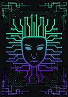 Een gestileerd menselijk gezicht is afgebeeld op een donkere achtergrond, omringd door een complex netwerk van printplaatachtige lijnen. De lijnen hebben een kleurverloop van groen en paars, waardoor een visueel opvallend contrast ontstaat tegen de zwarte achtergrond. Het gezicht is zwart omlijnd en heeft een minimalistisch ontwerp, waarbij alleen de ogen, neus en mond zichtbaar zijn.