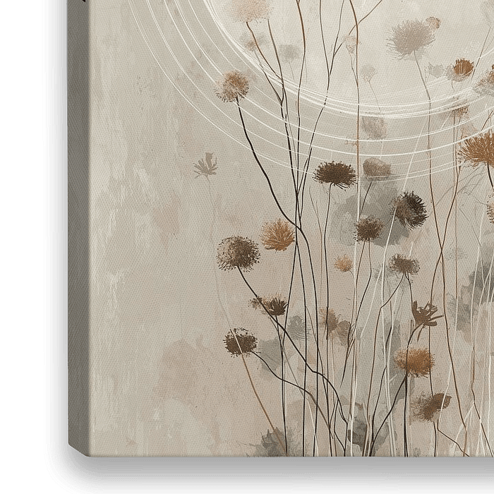 Een etherische illustratie waarin droge bloemen en zaden zich ontvouwen uit een concentrische cirkel, symbool van groei en innerlijke reflectie. De neutrale, warme kleurenpalet en fijne lijnwerk creëren een meditatieve sfeer vol poëtische vergankelijkheid. Dit werk spreekt tot degenen die beauty vinden in het voorbijgaande en troost…