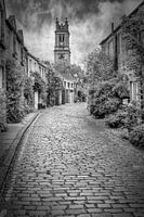 Circus Lane is een mooie oude straat uit 1765 in Stockbridge. St Stephen's Church werd voltooid in 1828. Klassiek monochroom stadsgezicht.