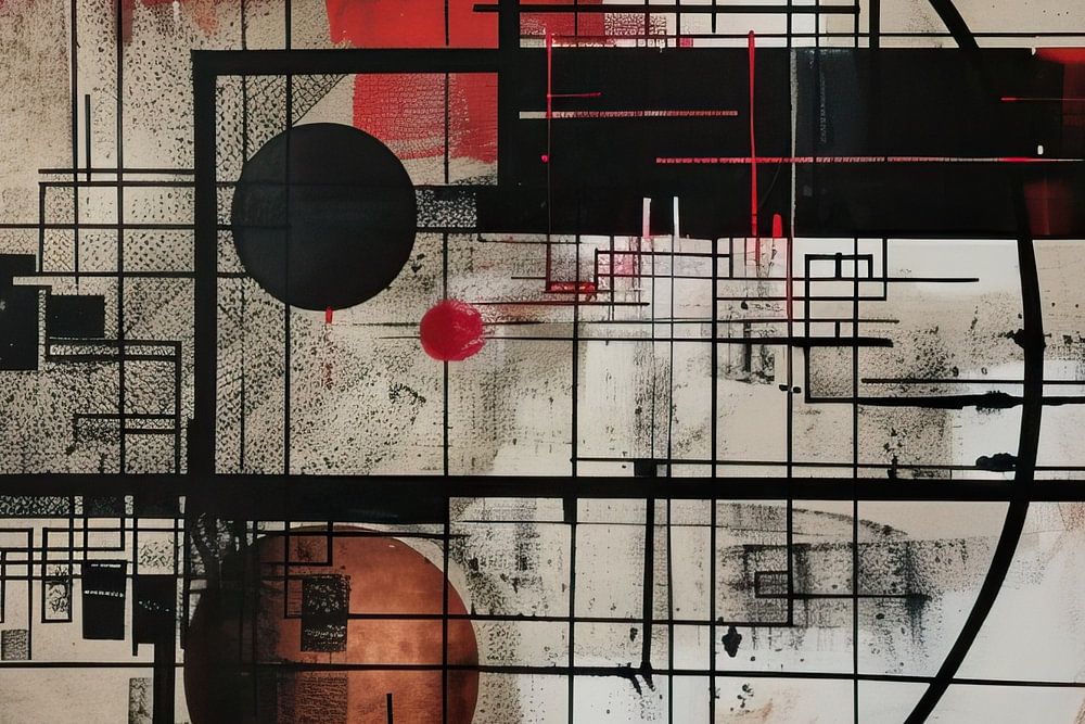 Details: abstract schilderij, moderne kunst, geometrische lijnen, rode accenten, zwart, wit, cirkel, textuur, dynamiek, energie