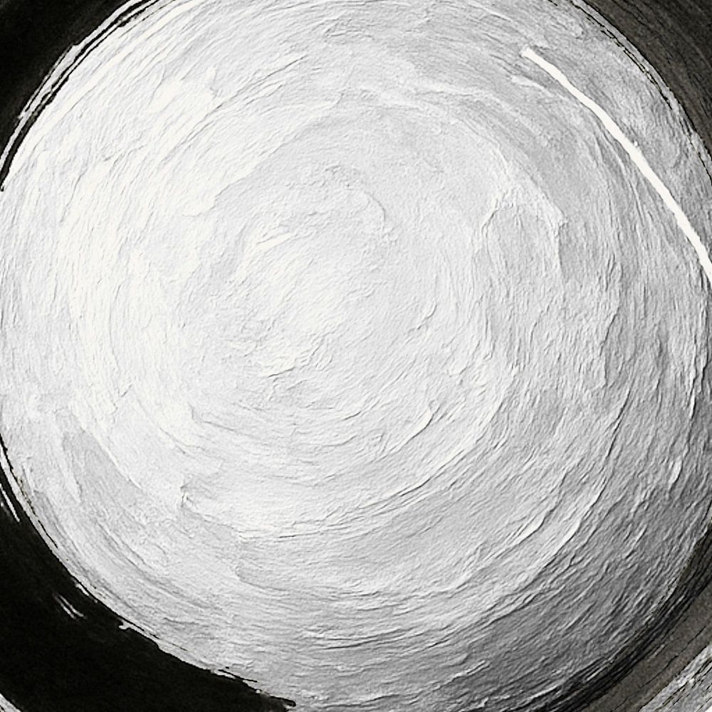 Gecentreerde cirkel in een vierkant met ruwe penseelstreken op de voor- en achtergrond.