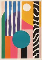 Een levendig abstract kunstwerk dat speelt met geometrische vormen en felle kleuren. In het midden is een grote turquoise cirkel omringd door verticale strepen in blauw, paars, roze en oranje. Aan de rechterkant voegt een geel vlak met een witte cirkel contrast toe, terwijl roze en een zwarte rechthoek eronder balans en diepte creëren.…