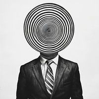 Er ontvouwt zich een monochroom spel van contrasten: een klassiek geklede man verliest zichzelf in een betoverend spiraalpatroon dat zijn hoofd vervangt. Deze visuele illusie roept vragen op over identiteit, perceptie en de grenzen van het menselijk bewustzijn. De eenvoudige elegantie van het pak staat in spannend contrast met de surrealistische, wervelende oneindigheid.