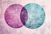 Cirkels Contrast - Dit abstracte schilderij presenteert twee grote overlappende cirkels in opvallende paarse en turquoise tinten op een zacht getextureerde, subtiele witte achtergrond.