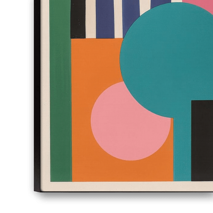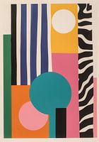 Een dynamisch abstract kunstwerk dat geometrische vormen en felle kleuren combineert. Een grote turquoise rondel, een kleinere roze rondel, een oranje vierkant en zwarte rechthoeken en een gestreepte zwarte balk vormen een evenwichtige compositie. Een grote witte rondel in de rechterbovenhoek zorgt voor extra accenten. Er ontstaat een spel van vorm, kleur en structuur op een lichte achtergrond, waarbij beweging en balans worden gecombineerd. Dit minimalistische werk viert de helderheid van geometrische abstractie en modern kleurontwerp.