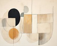 Cirkels in Balans | Abstracte Geometrie - Dit abstracte schilderij kenmerkt zich door een samenspel van geometrische vormen in een gebalanceerde compositie. Rustige aardetinten worden onderbroken door een prominente zwarte cirkel en enkele grijstonen, wat een gestructureerd maar speels geheel creëert tegen een neutrale…