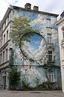 Een expressief urban kunstwerk van een verweerde gevel met een cirkelraam naar een lucht vol wolken en vogels straalt een dromerige energie uit.