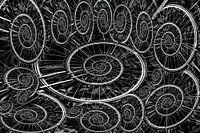 digitale bewerking van een fietswiel naar diverse spiralen in zwartwit