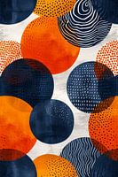 Het trendy kunstwerk is een fascinerende samenstelling van cirkels en patronen, waarbij het gebruik van de kleuren oranje en blauw een levendige dynamiek creëert.