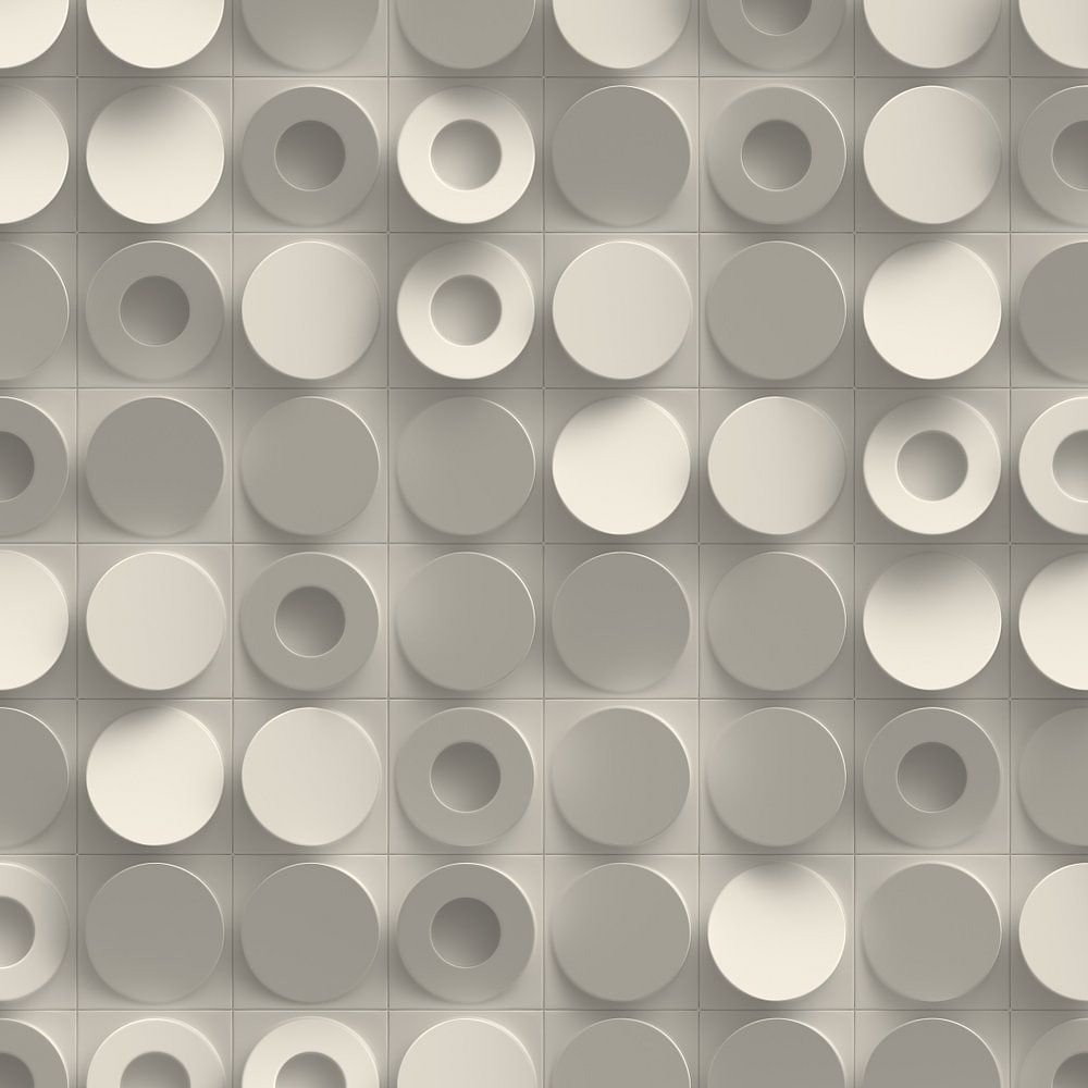 Veel tegels met verschillende cirkels vormen een reliëfachtige uitstraling.