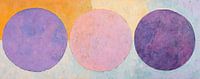 Cirkeltrio | Abstracte Compositie met Drie Cirkels - Dit abstracte schilderij toont drie grote, overlappende cirkels met een achtergrond van gele en blauwe verftexturen, waarbij elk van de cirkels een andere tint paars vertoont.