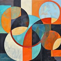 Deze indrukwekkende afbeelding toont een harmonieuze opstelling van cirkels en kleurvlakken in warme en koele tinten. De combinatie van strenge geometrische vormen en levendige kleuren geeft het kunstwerk een eigentijdse en energieke uitstraling. Perfect voor liefhebbers van abstracte kunst en moderne decoratie, brengt dit stuk een creatief en dynamisch tintje aan je huis. Het is ideaal voor woonkamers of kantoren en een opvallende toevoeging aan elke kunstcollectie.