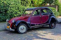 Nostalgie. Lelijk Eendje (Lelijke Eend) , Citroën Deux Chevaux 2CV in een lommerrijke straat, Nederland. Auto in de kleuren zwart en donkerrood. Vintage retro stijl. Oude tijden herleven. Vijftiger en zestiger jaren (50s, 1950s, 60s, 1960s). Fifties, Sixties.