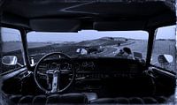 Foto van een Toscaans landschap vanuit de binnenzijde van een Citroën DS 23 Pallas gemaakt. Het dashboard van de klassieker op de voorgrond. Deze foto heeft een blauwe retro look.