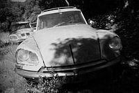Een slapende, roestende, beige, Citroën DS station in een treintje van schoonheden, zwart/wit op een veldje met slapende schoonheden ergens in de Dordogne, Frankrijk.