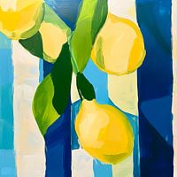 Heldere, zonnige citroenen bengelen aan frisse, groene bladeren. Hun levendige gele kleur vormt een stralend contrast met de koele blauwe strepen op de achtergrond. Deze harmonieuze compositie brengt een gevoel van frisheid en levendigheid over dat de kijker meeneemt naar een zomerse tuin.