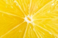 Close up van een dwarsdoorsnede van een frisse gele citroen met het hart van de zure citrusvrucht in het midden.