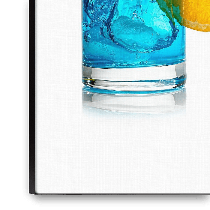 De afbeelding toont een helder drinkglas gevuld met blauwe vloeistof en een aantal ijsblokjes, waaruit een krachtige plens water naar boven komt. Op de rand van het glas ligt een perfect gesneden schijfje citroen, waarvan de felgele kleur een sterk contrast vormt met de blauwe vloeistof. De scène straalt een gevoel van frisheid,…
