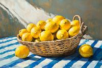 Felgele citroenen liggen te juichen in de royale mand, terwijl hun levendige kleur contrasteert met het zachte blauw en wit van het gestreepte tafelkleed. Het gladde, glanzende oppervlak van het fruit nodigt uit om een hapje te nemen, terwijl de subtiele schaduwen een harmonieus evenwicht creëren tussen licht en textuur. Een fris, zonnig arrangement dat meteen de lente in de kamer brengt.