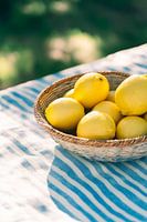 De felgele citroenen schitteren in de warme zon in een gevlochten mand, terwijl zachte schaduwen dansen op het gestreepte doek. Hun sprankelende frisheid belooft zomerse verfrissing en wekt het verlangen naar pittige drankjes en culinaire experimenten. Een eenvoudig maar levendig stilleven dat de zintuigen prikkelt.