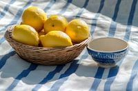 De felgele citroenen schitteren fris en zonnig in hun geweven mand, terwijl de zachte strepen op de achtergrond een ontspannen, zomerse sfeer creëren. Een delicate blauwe schil ligt ernaast en wekt de verwachting van de heerlijke smaken die deze verse vruchten beloven. Een rustig feest van kleuren en geuren!
