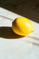 Een felgeel citroenaccent rust op een gemarmerd oppervlak en vangt zacht licht dat de glanzende textuur benadrukt. Het spel van licht en schaduw geeft de afbeelding een levendige dynamiek. Deze afbeelding is perfect voor de keuken en brengt een frisse, pittige charme in elke kamer.