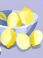 Stilleven van gele citroenen in een paarse kom tegen een paarse achtergrond, Aquarel, Zomerse frisheid