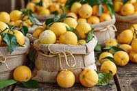 Breng een vleugje frisheid in je keuken met deze prachtige citroenen op een houten tafel. Perfect voor een stillleven of om je interieur op te fleuren.