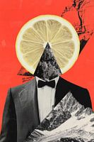 Een frisse, surrealistische aanblik ontvouwt zich: een elegante man in pak met een hoofd gemaakt van een gloeiend schijfje citroen, dat er ook uitziet als een piramide. De combinatie van ruige bergen en het warme rood van de achtergrond geeft de scène een exotische energie die de kijker uitnodigt om te glimlachen en zich te verwonderen.