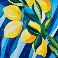 Felgele citroenen lijken vrolijk te glimlachen vanaf het doek terwijl ze speels afsteken tegen koele blauwe en groene achtergronden. Met hun levendige kleuren en dynamische opstelling stralen ze frisheid en vitaliteit uit en nodigen ze je uit om te genieten en te experimenteren - een waar feest voor de zintuigen!