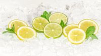fruit met ijsblokjes. Gesneden citroenschijfjes met ijsblokjes en blaadjes munt op een witte achtergrond. Lekker fris en gezond 2021. Eten en drinken.