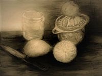 Citroen / Citroentje / Vitamine C / Acrylverf / Stilleven / Fruit / Vrucht / Tropisch fruit / Fruitbomen / Vruchtenpers / Uitpersen / Sap /Vruchtensap / Gezond / Glas / Mes / Snijden / Opdrinken / Zuur / Geel / Oranje geel / Wit /Bruin / Keuken / Koken / Houtenplank/ Zwart -Wit/ Nostalgisch