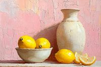 Een sereen stilleven in zachte tinten, waar felgele citroenen contrasteren tegen een poederroze achtergrond. Een witte keramische vaas en kom vormen een elegant ensemble met de verse citrusvruchten, waarvan er één kunstig is aangesneden. Het spel van licht en schaduw geeft het geheel een tijdloze, bijna klassieke uitstraling met een moderne twist.