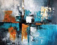 Details: abstracte kunst, moderne schilderkunst, dynamische schilderij, texturen, oranje, turquoise, rechthoekig