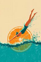 Een dynamische illustratie waarin een duiker elegant langs een sinaasappelschijf als zon springt in turquoise water. De compositie combineert het frisse van citrus met de beweging van water in een minimalistisch kleurenpalet van oranje en turquoise tinten, wat resulteert in een verfrissend zomers beeld dat energie en vitaliteit uitstraalt.