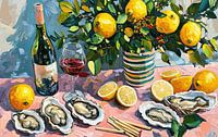 Deze levendige compositie is een kleurrijk eerbetoon aan zomerse elegantie, waar oesters, citroenen en rode wijn samenkomen op een tafel badend in mediterrane charme. De kunstenaar gebruikt een gedurfde, pasteuze schildertechniek met dikke, zichtbare penseelstreken die structuur en energie aanbrengen in het beeld.