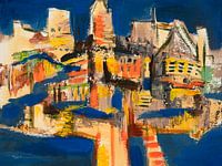 Het schilderij ‘City Break’ toont een stad die uitnodigt tot ontdekking. Het is een bestemming vol kleur, contrast en beweging. Door de stad stroomt water en er is een waterval te zien. De stedelijke vormen doen je verlangen naar een inspirerende stedentrip. Het werk vangt de energie van een plek waar natuur en architectuur elkaar ontmoeten.