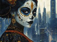 City Lights Enchantress - Dit portretschilderij toont een indrukwekkende vrouw met een gedetailleerd masker en exotische sieraden, tegen een achtergrond van een verlichte nachtelijke stadsskyline.