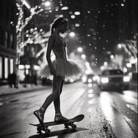 In de Stad die Nooit Slaapt: Een jonge ballerina skatet door de verlaten straten van New York, haar bewegingen verlicht door de flikkerende koplampen van voorbijrijdende auto's. Een dans van eenzaamheid en vrijheid, in de stille nacht van de stad die nooit slaapt.