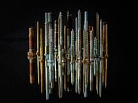 Verzameling schroeven met verschillende lengtes op een spiegel creëren een virtuele city skyline.